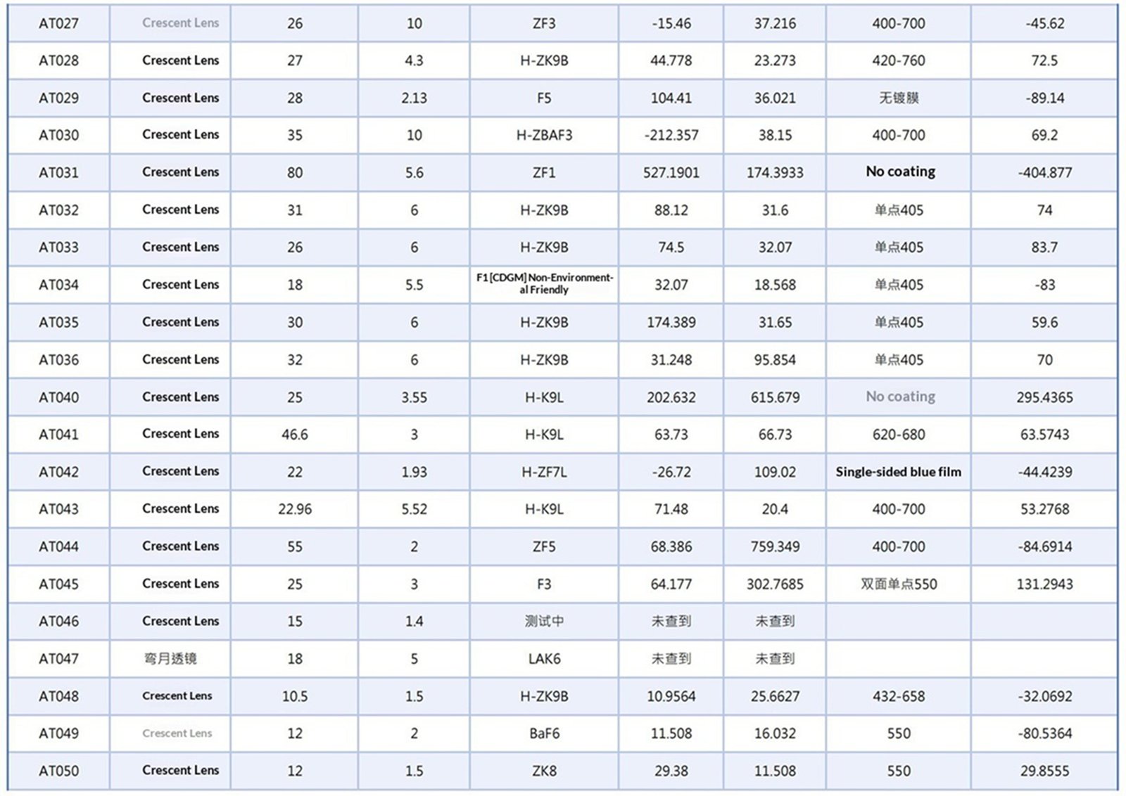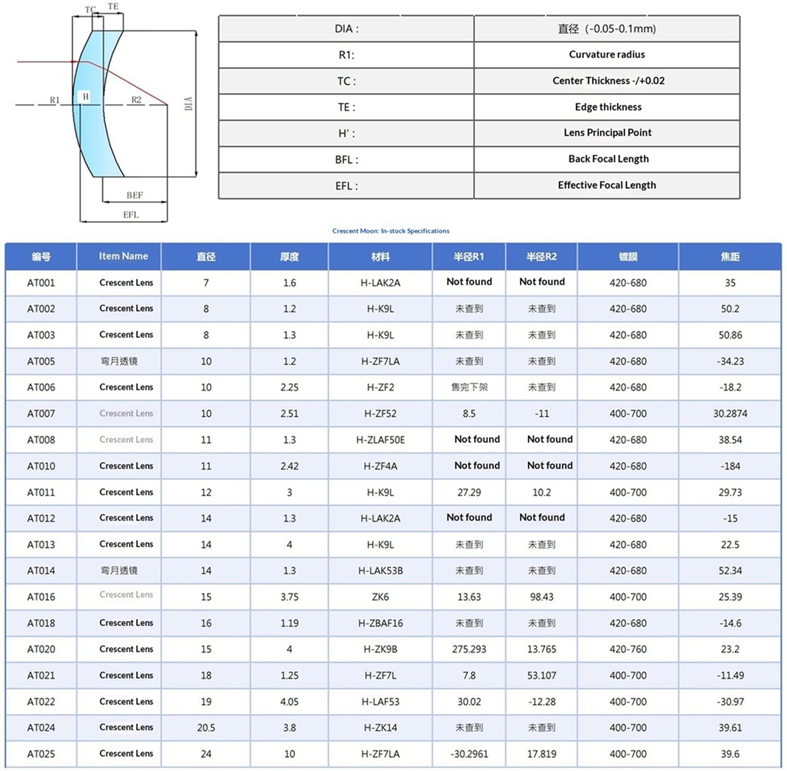 A positive crescent lens is composed of two curved surfaces with similar radii of curvature and has a positive focal length. Usually used to reduce the focal length of another lens, increase the numerical aperture, and other related applications. To reduce spherical aberration, the beam should be incident on the convex surface of the lens when expanding, contracting, or diverging collimated light applications; When used for converging and collimating light, the beam is incident on a concave surface.
