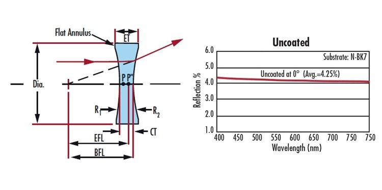تتكون العدسة ثنائية التقعر من سطحين منحنيين متجهين للداخل ومتطابقين ولهما بُعد بؤري سالب. وهي تُستخدم لإنشاء صور مصغرة أو أشعة ضوئية متباعدة، وتقاس جميع أقطارها بالملليمتر.