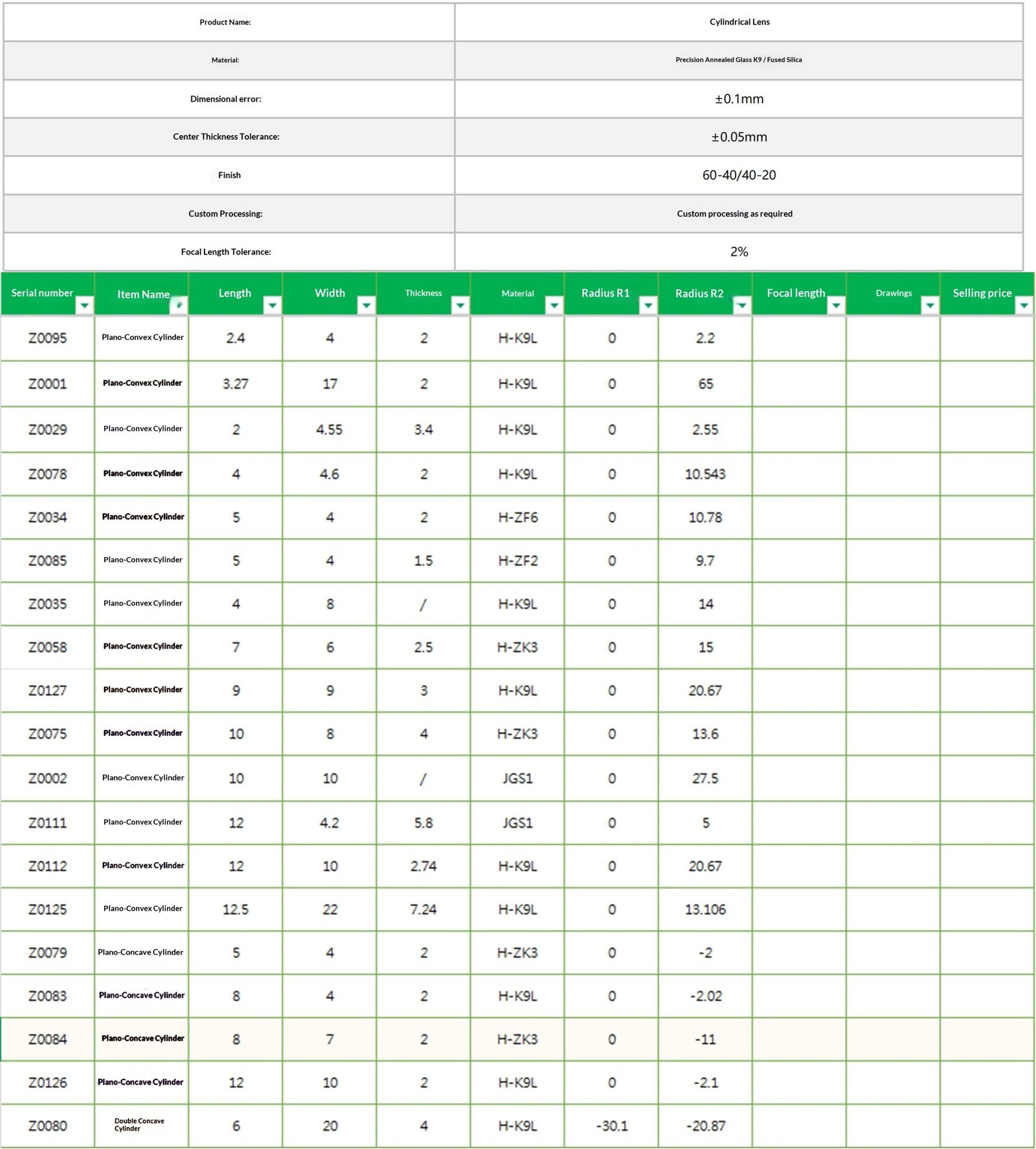 평면 볼록 원통형 표면 렌즈 H-K9L Z0001
