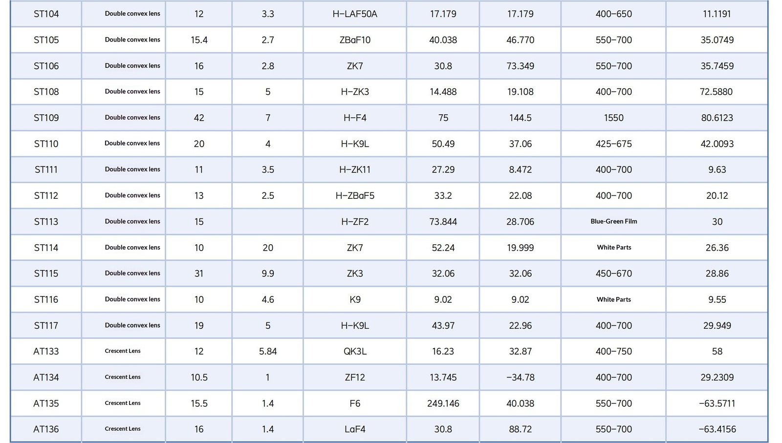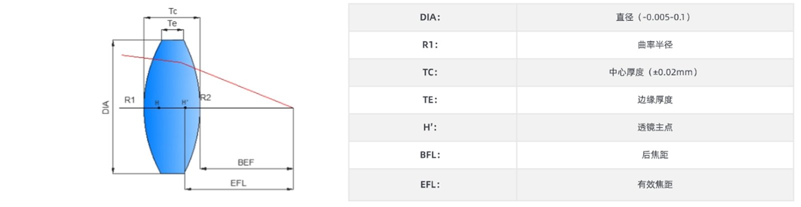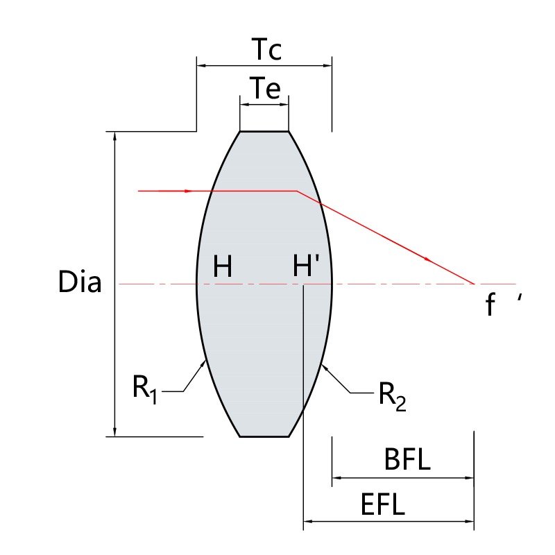 Double Convex Lenses are composed of two convex surfaces with equal radii, which can focus light into a point with a positive focal length. Due to the symmetrical shape on both sides, it becomes a more suitable unit for 1:1 imaging applications. Commonly used in imaging relay systems and for object imaging or beam focusing, collimation, and beam expansion at finite conjugate distances. The characteristic of a biconvex lens is that the larger the conjugate ratio, the greater the aberration produced. A biconvex lens is suitable for situations where the object and image are located on both sides of the lens, and the ratio of image distance to object distance (conjugate ratio) is between 0.2 and 5.